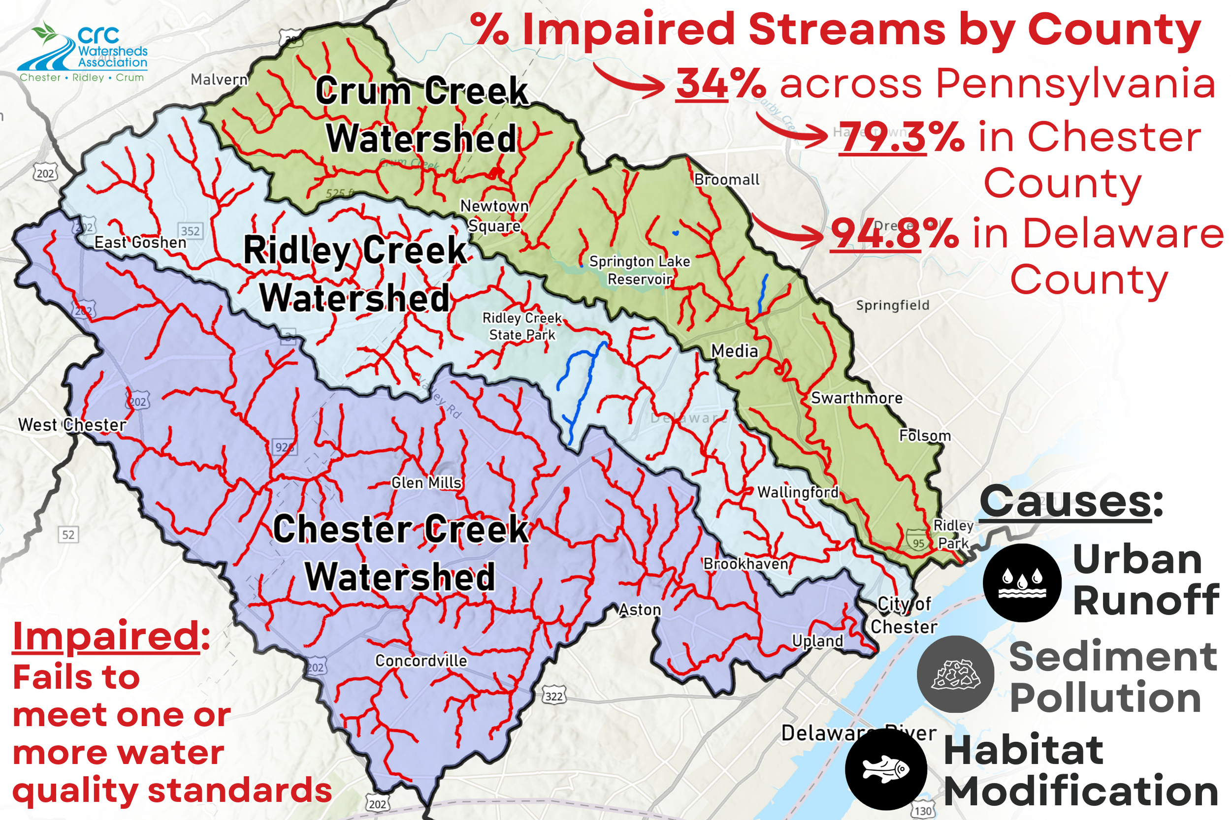According to the Pennsylvania Department of Environmental Protection, Nearly 95% of our creeks in Delaware County and nearly 80% of those in Chester County are considered impaired by the state of Pennsylvania. We can change this together.